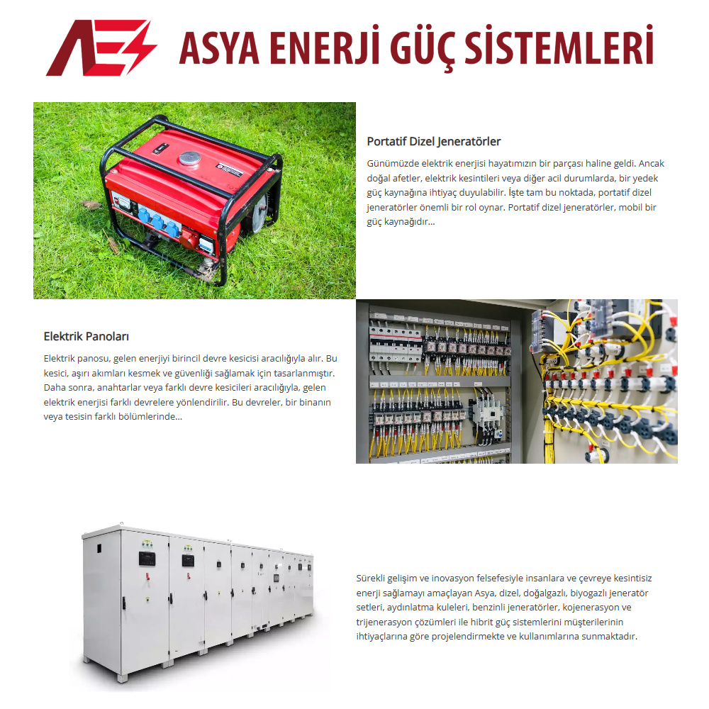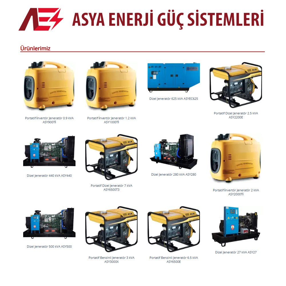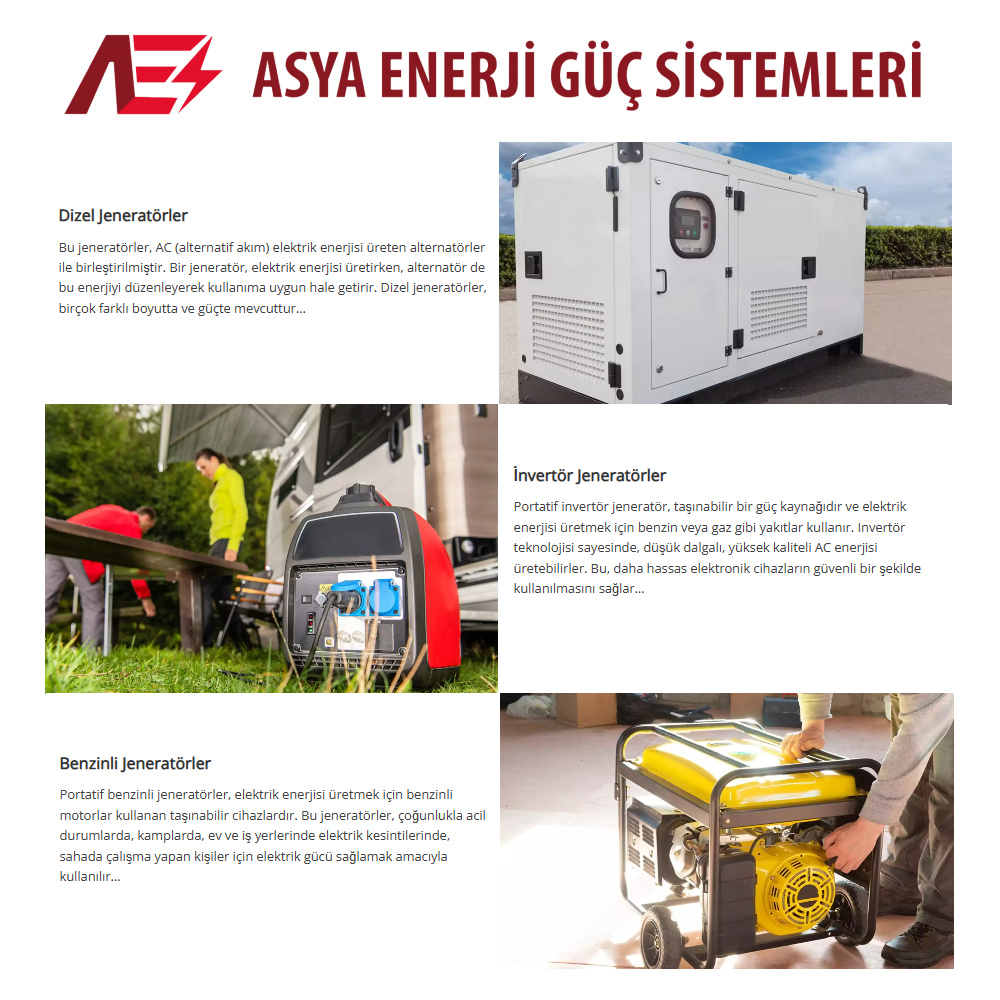 Asya Enerji Güç Sistemleri, 2003 yılında İstanbul’da kurulmuş güç sistemleri üreten bir firmadır. Sürekli gelişim ve inovasyon felsefesiyle insanlara ve çevreye kesintisiz enerji sağlamayı amaçlayan firmamız, dizel, doğalgazlı, biyogazlı jeneratör setleri, aydınlatma kuleleri, benzinli jeneratörler, kojenerasyon ve trijenerasyon çözümleri ile hibrit güç sistemlerini müşterilerinin ihtiyaçlarına göre projelendirmekte ve kullanımlarına sunmaktadır.