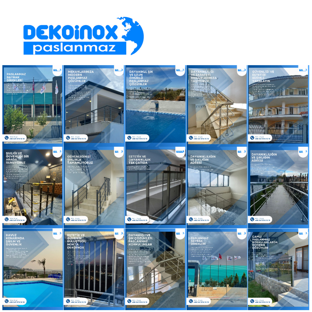 Dekoinox Paslanmaz, Dalgacıoğlu Yapı’nın bir alt şirketi olarak paslanmaz ve korkuluk çözümleri alanında faaliyet göstermektedir. Kalite, güven ve estetiği bir araya getiren firmamız, Dalgacıoğlu Yapı’nın sektördeki tecrübesi ve güvenilirliği ile daha da güçlenmiştir. Müşterilerimize en iyi hizmeti sunmak için yenilikçi üretim anlayışımızla çalışmalarımıza devam ediyoruz.