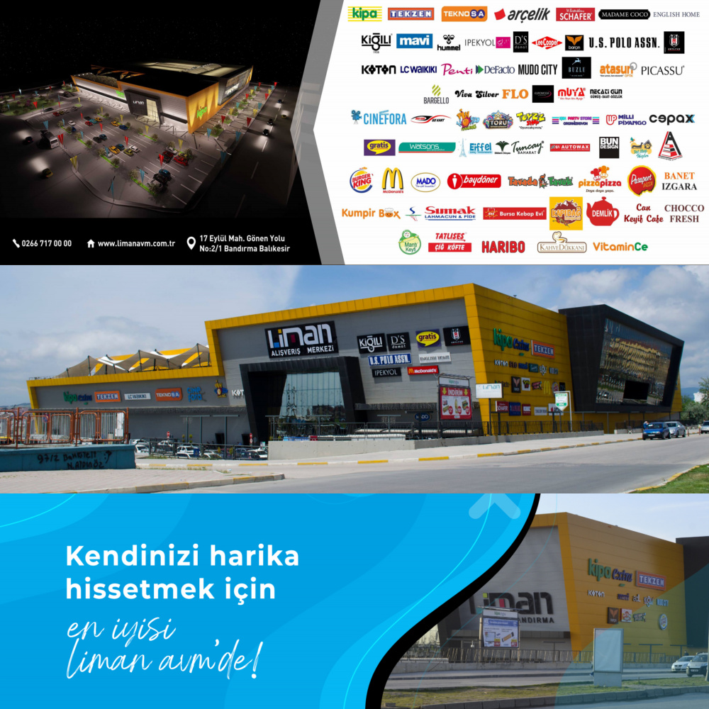 Her biri ayrı yaşam alanı olarak tasarlanmış olan Bandırma Liman AVM’nin geniş katları, ferah ve şık mimarisi ile sektördeki paydaşlarından farklı misyonlar üstlenmiştir. Bandırma’nın merkezinde yer alan Liman AVM, Türkiye’nin en seçkin ve üst düzey markalarına Bandırma’da ilk kez ev sahipliği yapmıştır. Özgün çizgisiyle Bandırma ve çevre ilçelerden hedeflediği müşteri profilini kısa zamanda yakalayan Bandırma Liman AVM, aylık ortalama 400 bin ziyaretçiyi ağırlamanın mutluluğunu yaşamaktadır.