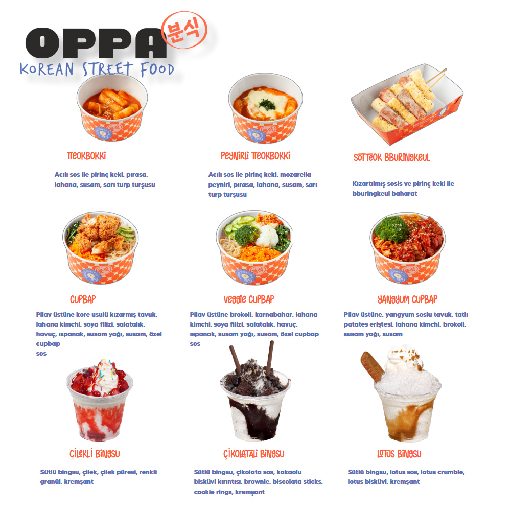 Self servis modeli ve renkli, güven verici, yenilikçi tasarımlarıyla Oppa, huzurlu ve zamansız bir atmosfer oluşturur. Minimum 9 m²’lik bir alanda çalışabilen bu konsept, küçük ama etkili bir operasyon modeli sağlar. Oppa’nın temel amacı, dünya genelinde sevilen Kore mutfak lezzetlerini Türkiye halkı ile buluşturarak geniş bir kitleye ulaşmaktır.
