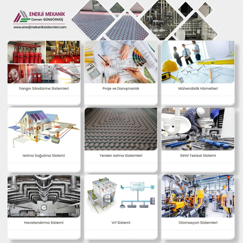 Firmamız Isıtma, soğutma, doğalgaz, klima, havalandırma, yalıtım malzemeleri, yangın tesisat sistemleri ile ilgili proje, satış, taahhüt ve teknik danışmanlık Konularında faaliyet göstermektedir Her geçen gün gelişmekte ve globalleşmekte olan dünyanın sektörel bazdaki teknik ve mühendislik yeniliklerin takipçisi olarak, faaliyet gösterdiğimiz uzmanlık ve tecrübe gerektiren önemli projelerde, birlikte çalıştığımız firmalara güvenilir ve güçlü teknik partner ve çözüm ortaklığı sunmayı firmamız hedef edinmiştir.
