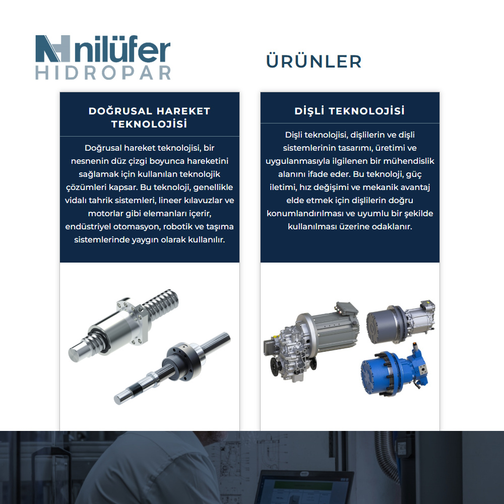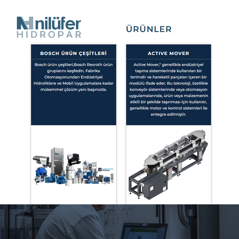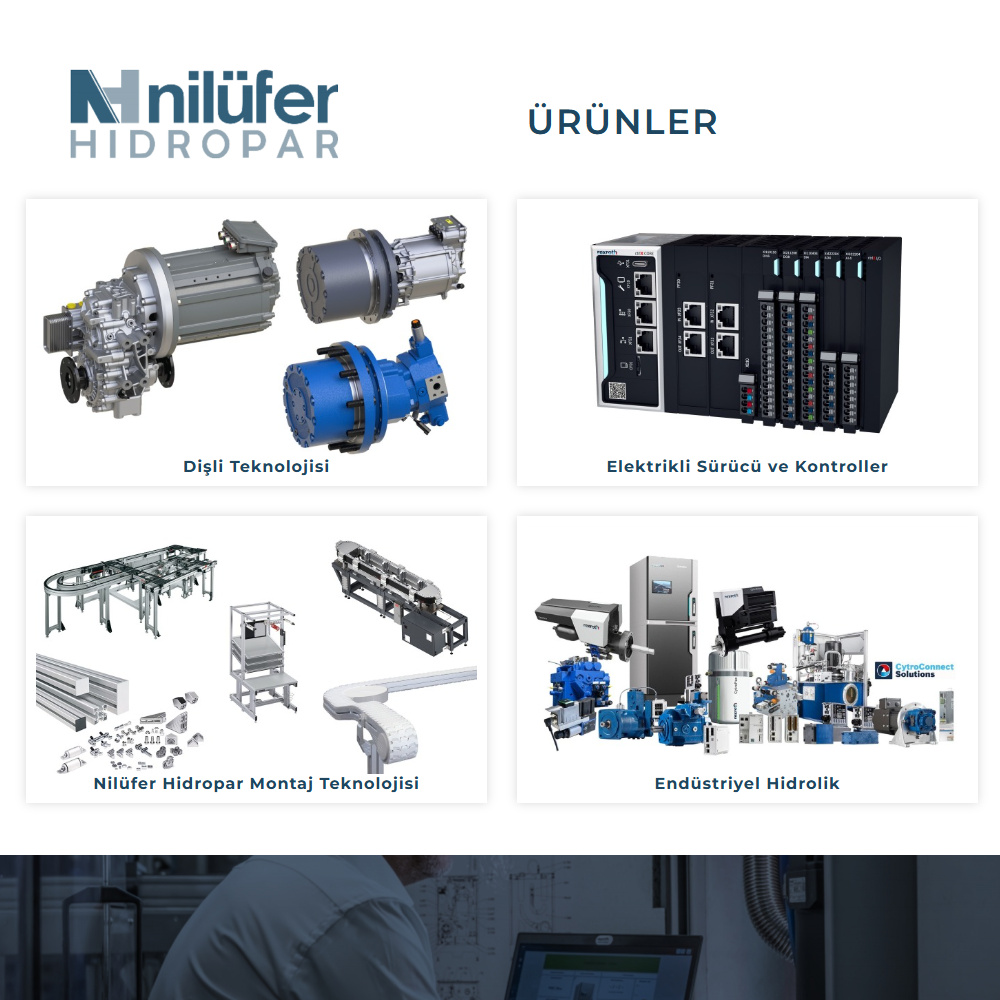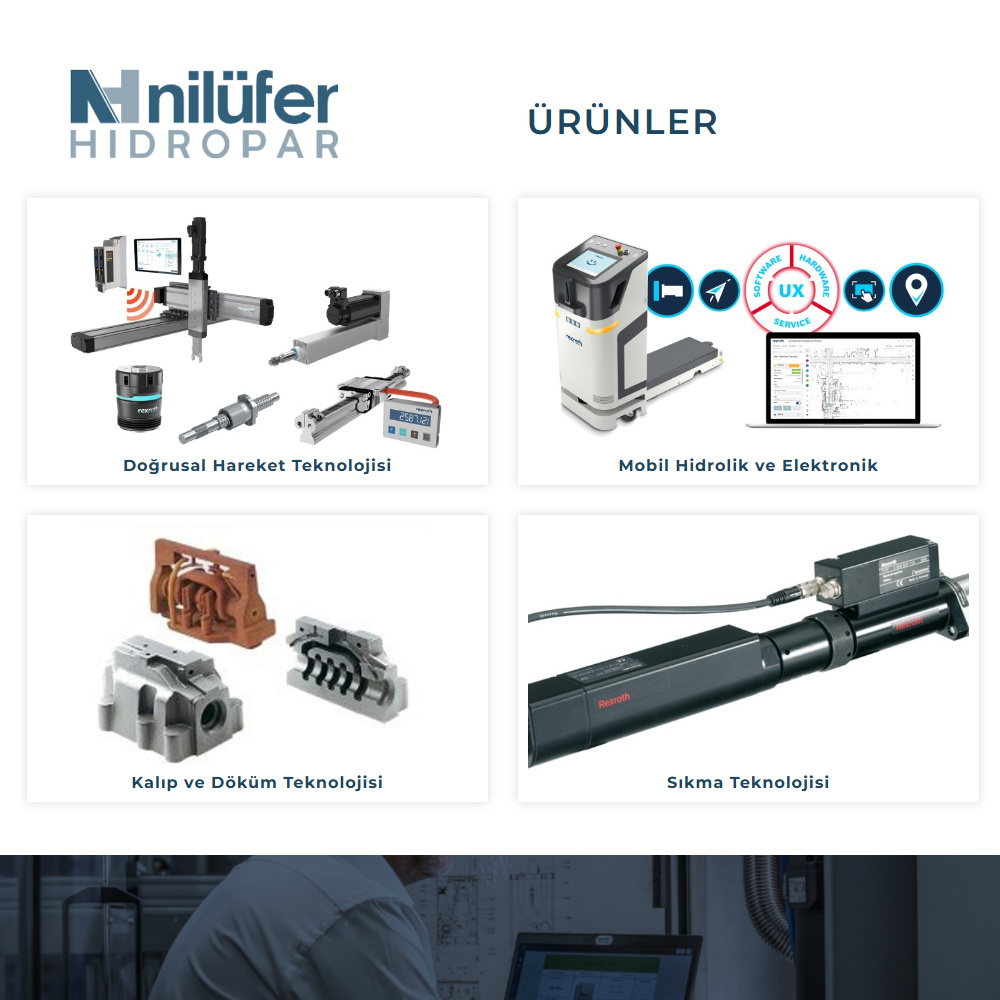 Günümüzdeki teknolojik gelişmeler, güç ve hareket üreten sistemlerde kullanıcıların daha rahat ve kolay bir deneyim yaşamasını sağlayan önemli değişikliklere neden olmaktadır. Hidrolik, pnömatik ve otomasyon alanında faaliyet gösteren firmamız, Bosch Rexroth Ana Bayisi Nilüfer Hidropar olarak, genç, araştırmacı ve profesyonel bir çalışma disipliniyle faaliyet gösteriyoruz.