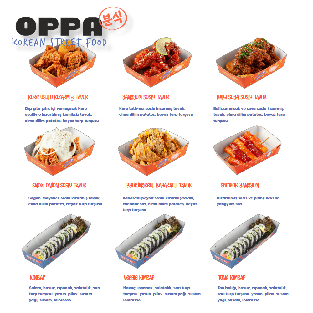 Self servis modeli ve renkli, güven verici, yenilikçi tasarımlarıyla Oppa, huzurlu ve zamansız bir atmosfer oluşturur. Minimum 9 m²’lik bir alanda çalışabilen bu konsept, küçük ama etkili bir operasyon modeli sağlar. Oppa’nın temel amacı, dünya genelinde sevilen Kore mutfak lezzetlerini Türkiye halkı ile buluşturarak geniş bir kitleye ulaşmaktır.